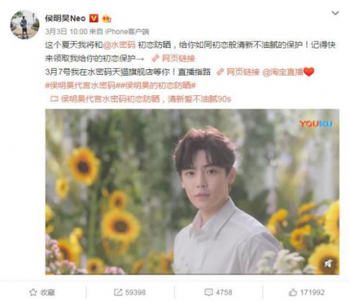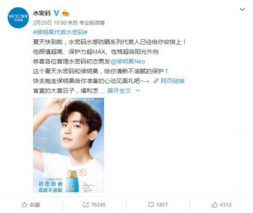 综合以上原因,水密码便火速签约侯明昊作为水感防晒系列的代言人,为他定制了“初恋男友”的人设,并以“初恋防晒,清新不油腻”的传播主题,精准触达侯明昊的粉丝圈层,让她们进一步强化对品牌的情感认同和归属,驱动理性消费向感性消费转化,成为品牌的忠实消费者。